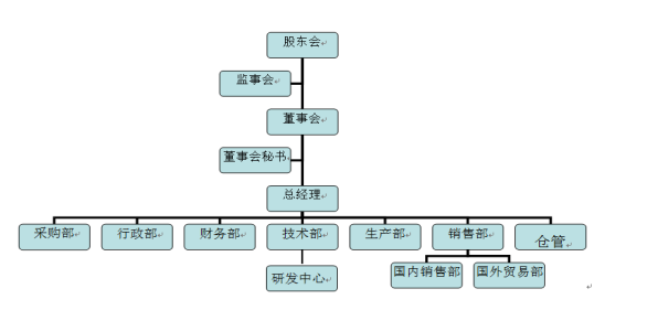公司根據業(yè)務流程,設計和建立了組織架構,目前設立了8個職能部門,部門除了各負其責外,部門之間還相互協(xié)調合作,確保管理責任的落實。
